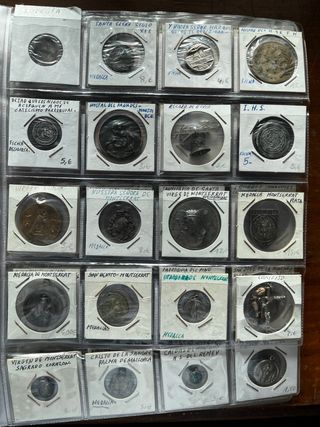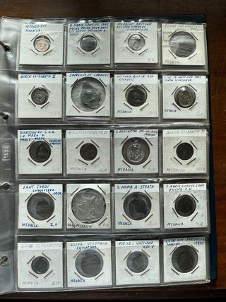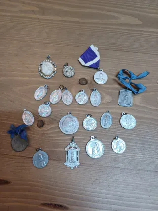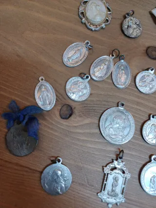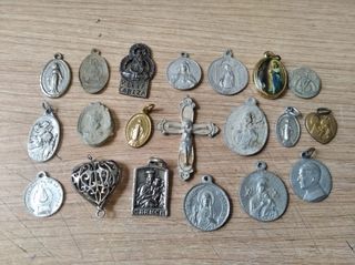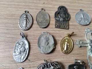 Conjunto de medallas religiosas antiguas, cada una con su propio diseño y significado. - Variedad de diseños y tamaños. - Algunas medallas presentan inscripciones. - Piezas con historia y devoción. ref.cazul15