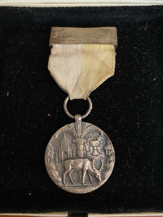 Medalla antigua con un diseño detallado de un ciervo junto a una fuente y arquitectura. - Presentada en su caja original. - Cinta de tela para colgar.