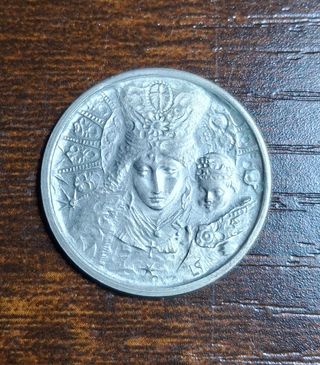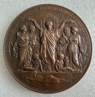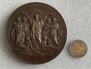 Medalla conmemorativa de la Exposición Universal de París de 1878, diseñada por el medallista francés Eugène-André Oudiné y fabricada en Francia. Esta medalla celebra la Exposición Universal Internacional, un gran evento donde se presentaban avances industriales, científicos y artísticos del siglo XIX. La pieza muestra figuras alegóricas de las artes y la industria, junto con símbolos de la República Francesa y referencias a autoridades de la época. (Moneda de 2€ como referencia de tamaño, no se envía)