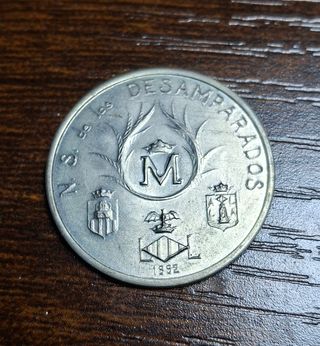 medalla conmemorativa de la Virgen de los Desamparados, patrona de la ciudad de Valencia y de la Comunidad Valenciana. Incluye el texto "N. S. de los DESAMPARADOS" y el año de acuñación, 1992, en la parte inferior.