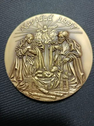 Medalla conmemorativa de la Navidad de 1997. - Representa la escena del Nacimiento. - Diseño en relieve con acabado metálico. Peso de 300gr. Raras de encontrar,de 9cm. De diámetro En su caja original CONSULTAR CUALQUIER DUDA Más metopas en mi perfil