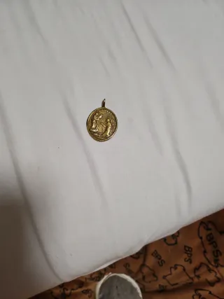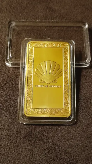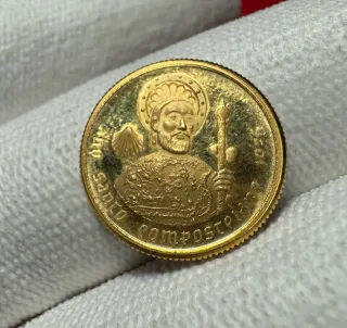 Medalla de oro con la imagen de Santiago Apóstol. Peso:3,53 Oro:900 - Detalle de la concha de peregrino. - Inscripción O ano Santo Compostela 1970.