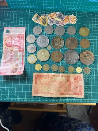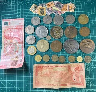 Colección de monedas y medallas antiguas, ideal para coleccionistas. - Incluye billete de 5000 Guaraníes de Paraguay. - Incluye billete de 1 Lempira de Honduras. - Variedad de monedas de diferentes países y épocas. - Medallas conmemorativas y artísticas.