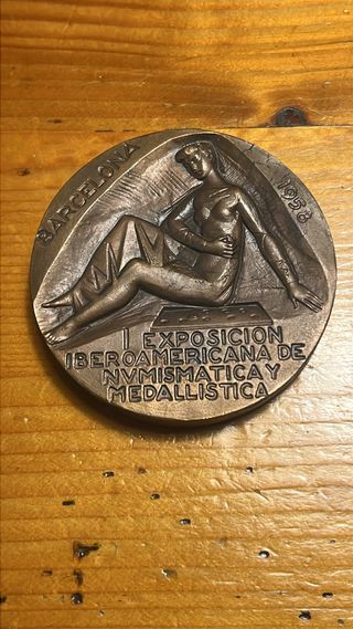 Medalla conmemorativa de la I Exposición Iberoamericana de Numismática y Medallística celebrada en Barcelona en 1958. Presenta una figura femenina sentada y detalles grabados. - Diseño con figura femenina. - Inscripción: BARCELONA 1958. - Leyenda: I EXPOSICION IBEROAMERICANA DE NUMISMATICA Y MEDALLISTICA. Bronce 350 gramos .