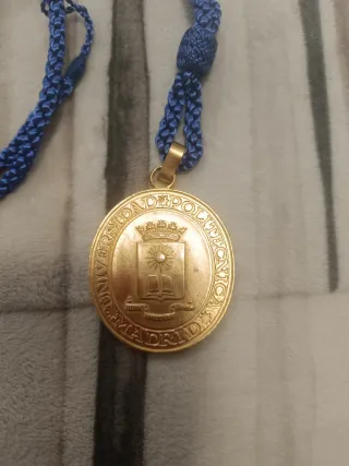 Medalla dorada de la Universidad Politécnica de Madrid. Presenta el escudo de la universidad con un libro abierto y un sol radiante. - Diseño circular. - Cordón azul trenzado.