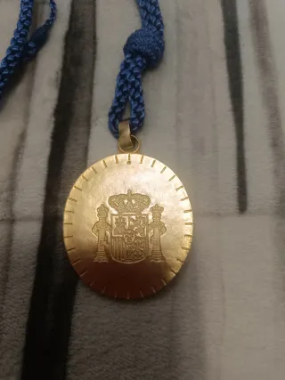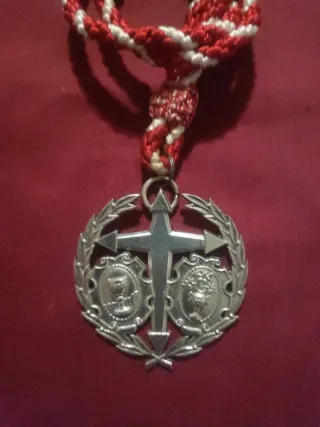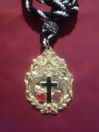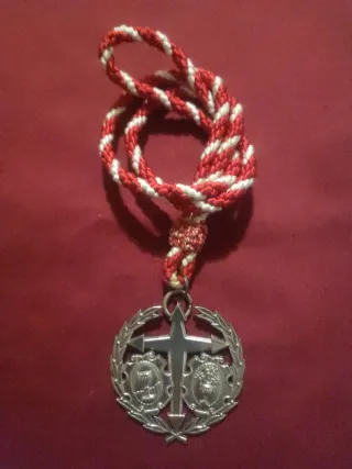 Medalla con cordón trenzado en rojo y blanco. Ideal para coleccionistas y devotos. Un regalo perfecto. - Diseño de cruz central. - Enmarcada por una corona de laurel. - Dos escudos circulares en la parte inferior. PRECIO NEGOCIABLE.