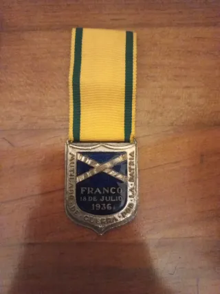 Medalla conmemorativa Mutilado de Guerra por la Patria. Época de Franco. - Cinta de color amarillo con bordes verdes. - Insignia con escudo y la inscripción FRANCO 18 DE JULIO 1936. - Inscripción MUTILADO DE GUERRA POR LA PATRIA alrededor del escudo.