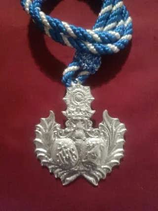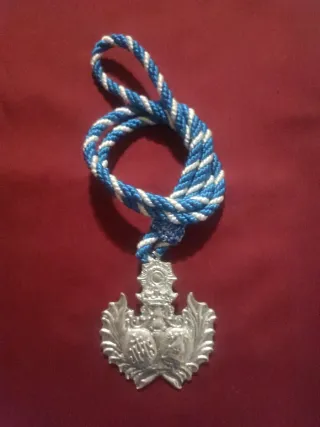Medalla con un diseño detallado y un cordón trenzado bicolor. Ideal para coleccionistas y amantes de la Semana Santa Sevillana. (MARRES SANTO). Un regalo perfecto. - Cordón de cuerda trenzada en azul y blanco. - Colgante metálico con escudo y detalles ornamentales. PRECIO NEGOCIABLE.