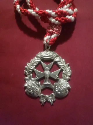 Medalla con un diseño detallado y un cordón trenzado en rojo y blanco. Ideal para coleccionistas y devotos. Un regalo perfecto. - Diseño de cruz de Malta. - Corona y laureles. - Escudos laterales. - Lazo inferior. PRECIO NEGOCIABLE.