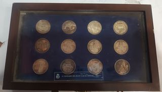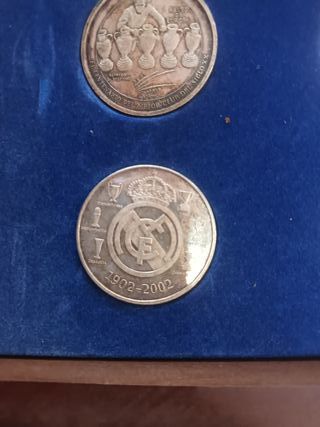 Vendo la serie completa de 12 medallas conmemorativas "El Centenario del Mejor Club del Siglo XX", emitida para celebrar los 100 años de historia del Real Madrid C.F. Detalles del artículo: Contenido: 12 medallas bañadas en plata que repasan hitos históricos (La Novena, el Once del Centenario, la era de las remontadas, etc.). Incluye su vitrina/estuche expositor original de madera con fondo de terciopelo azul. Observaciones: La caja presenta un fallo en la bisagra (ideal para manitas o para dejar fija en exposición). No se incluyen los fascículos, se vende exclusivamente la colección de medallas con su estuche.