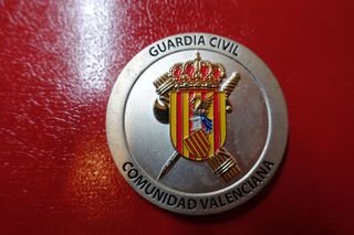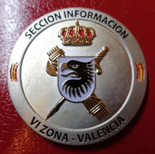 Medalla conmemorativa de la Guardia Civil. Medalla metálica institucional de la Guardia Civil, vinculada a la Comunidad Valenciana y a la Sección de Información – Vizcaya, una combinación territorial poco habitual que despierta especial interés entre coleccionistas de insignias policiales y objetos corporativos. La pieza presenta un sólido formato circular en metal plateado satinado, con escudo esmaltado en relieve y excelente contraste cromático. - Incluye corona, águila y espadas cruzadas. - Inscripción SECCION INFORMACION y VI ZONA - VALENCIA.