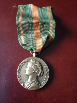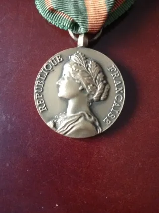 Medalla conmemorativa de la República Francesa. - Diseño con perfil de mujer Marianne y corona de laurel. - Inscripción République Française en el borde. - Cinta tricolor verde y naranja. Premio militar Francés, reconoce a los soldados Franceses que lograron escapar de los campos de prisioneros en la I y II guerra mundial.