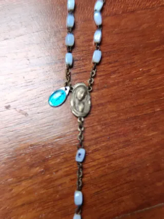 Elegante rosario con cuentas azul cielo y detalles metálicos. - Cruz con figura. - Medalla central. - Cuentas de color azul cielo.