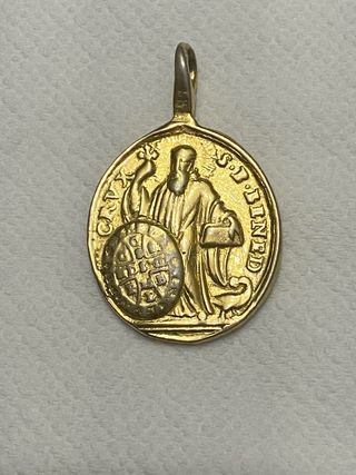 Medalla de metal con la imagen de San Benito y Montserrat. Un detalle religioso con un diseño clásico. - Material: Metal. - Representación: San Benito y Montserrat.