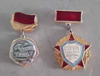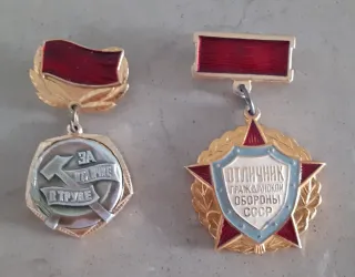 Lote de dos medallas de la Unión Soviética (URSS). - Medalla Por el Trabajo Destacado con martillo y hoz. - Medalla Excelente en Defensa Civil de la URSS con estrella y laureles. Época: Unión Soviética década de los 70. Estado bueno con esmalte original y sistema de sujeción completo