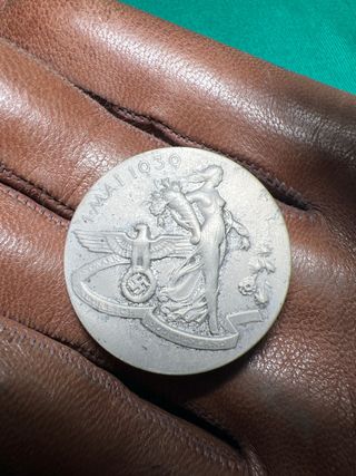 Medalla conmemorativa alemana del 1 de Mayo de 1939. Presenta un diseño detallado con una figura femenina y un águila. - Fecha: 1 de Mayo 1939 - Diseño: Figura femenina con flores y águila con esvástica - Inscripción: 1. MAI 1939 y DEUTSCHES REICH - Material: Metal plateado