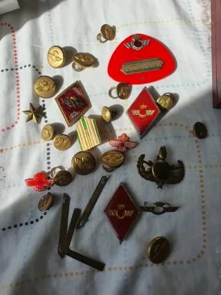 Conjunto de medallas y pines de colección, con diseños variados y detalles metálicos. - Incluye varias medallas redondas con emblemas. - Piezas con forma de rombo y escudo. - Elementos con alas y coronas. - Pines de solapa y broches..