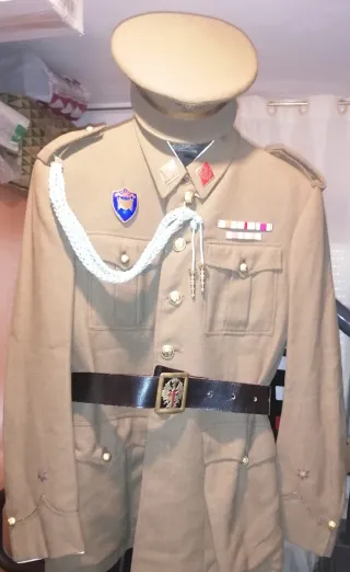 Uniforme militar de las Milicias Universitarias de alférez .Pos Guerra civil años 40 época de franco y flange. está en perfecto estado, consta de guerrera pantalón y gorra de alférez, es como una talla L de tamaño, en caso de alguna duda comunícamelo por mensaje y te responderé sin problema.ESCUCHO OFERTAS - Chaqueta de color beige. - Gorra a juego. - Cinturón de cuero negro con hebilla. - Distintivos y medallas. - Hombreras.