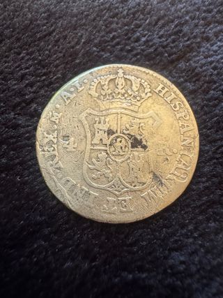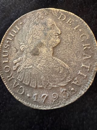 Moneda antigua de 8 Reales acuñada en Lima en el año 1793. Presenta un diseño detallado con el busto del rey. Corrosiones Naufragio. Pecio. - Canto con inscripciones. - Año de acuñación: 1793. - Origen: Lima. Preferible trato en mano. Hago envíos ordinarios (1€) o certificados (6€). Pago mediante bizzum o transferencia! NO LEER Euro, columnario, moneda, plata, real, peseta, real, escudo, billete, onza, colección, numismática, medalla, oro, cobre, Isabel II, resello, inversión, NGC, NCV, patagon, ducaton, franco.