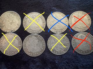 Conjunto de ocho monedas de 2 Reales de Carlos IV, acuñadas entre 1801 y 1808. Cecas Madrid y Sevilla. - Diseño con escudo coronado. - Inscripciones HISPAN y REX visibles. Precio por unidad Preferible trato en mano. Hago envíos ordinarios (1€) o certificados (6€). Pago mediante bizzum o transferencia! NO LEER Euro, columnario, moneda, plata, real, peseta, real, escudo, billete, onza, colección, numismática, medalla, oro, cobre, Isabel II, resello, inversión, NGC, NCV, patagon, ducaton, franco.