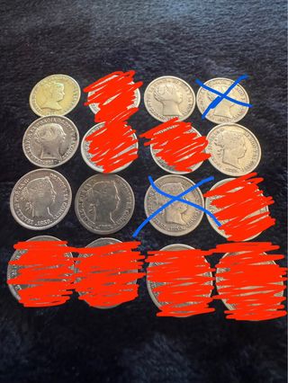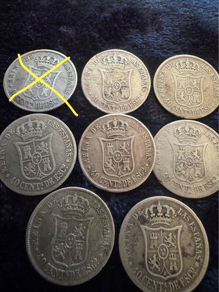 Conjunto de monedas de 40 céntimos de Isabel II, acuñadas en Madrid. - Incluye monedas de los años 1865, 1866, 1867 y 1868. - Diseño con el perfil de la reina Isabel II. - Inscripción DE DIOS Y LA CONST. Precio por unidad Preferible trato en mano. Hago envíos ordinarios (1€) o certificados (6€). Pago mediante bizzum o transferencia! NO LEER Euro, columnario, moneda, plata, real, peseta, real, escudo, billete, onza, colección, numismática, medalla, oro, cobre, Isabel II, resello, inversión, NGC, NCV, patagon, ducaton, franco.