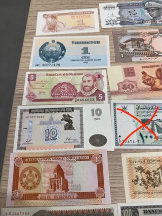 Colección de 33 billetes de diferentes países, todos sin circular. - Variedad de diseños y denominaciones. - Ideal para coleccionistas. Precio por unidad. Preferible trato en mano. Hago envíos ordinarios (1€) o certificados (6€). Pago mediante bizzum o transferencia! NO LEER Euro, columnario, moneda, plata, real, peseta, real, escudo, billete, onza, colección, numismática, medalla, oro, cobre, Isabel II, resello, inversión, NGC, NCV, patagon, ducaton, franco.