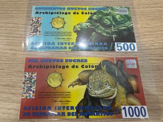 Dos billetes conmemorativos del Archipiélago de Colón, uno de 500 y otro de 1000 sucres. SIN CIRCULAR - Diseño con tortuga gigante y lagarto. - Representación de la Oficina Intercambiara de Ultramar del Antártico. - Incluyen sellos de seguridad holográficos. Preferible trato en mano. Hago envíos ordinarios (1€) o certificados (6€). Pago mediante bizzum o transferencia! NO LEER Euro, columnario, moneda, plata, real, peseta, real, escudo, billete, onza, colección, numismática, medalla, oro, cobre, Isabel II, resello, inversión, NGC, NCV, patagon, ducaton, franco.