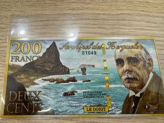 Billete conmemorativo de las Islas Kerguelen, con valor de 200 Francos. SIN CIRCULAR - Diseño que incluye un paisaje de las islas y el retrato de René Bossière. - Fecha de emisión: 5-NOV-2010. - Número de serie: 01049. Preferible trato en mano. Hago envíos ordinarios (1€) o certificados (6€). Pago mediante bizzum o transferencia! NO LEER Euro, columnario, moneda, plata, real, peseta, real, escudo, billete, onza, colección, numismática, medalla, oro, cobre, Isabel II, resello, inversión, NGC, NCV, patagon, ducaton, franco.