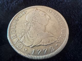 Moneda de 8 Reales de 1772, perteneciente al reinado de Carlos III. Una pieza rara y coleccionable. LETRAS INVERTIDAS. Año ESCASO - Canto con inscripción. - Diseño detallado del escudo de España. Preferible trato en mano. Hago envíos ordinarios (1€) o certificados (6€). Pago mediante bizzum o transferencia! NO LEER Euro, columnario, moneda, plata, real, peseta, real, escudo, billete, onza, colección, numismática, medalla, oro, cobre, Isabel II, resello, inversión, NGC, NCV, patagon, ducaton, franco.