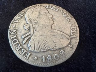 Moneda de 8 Reales acuñada en México en el año 1809. Presenta el busto del rey Fernando VII. Busto imaginario. - Canto estriado. - Diseño detallado. Preferible trato en mano. Hago envíos ordinarios (1€) o certificados (5,5€). Pago mediante bizzum o transferencia! NO LEER Euro, columnario, moneda, plata, real, peseta, real, escudo, billete, onza, colección, numismática, medalla, oro, cobre, Isabel II, resello, inversión, NGC, NCV, patagon, ducaton, franco.
