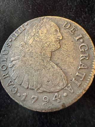 Moneda de plata de 8 Reales acuñada en Potosí en el año 1794. Presenta el busto de un monarca. - Canto con grecas. - Leyenda: CAROLUS III DEI GRATIA 1794. Preferible trato en mano. Hago envíos ordinarios (1€) o certificados (5,5€). Pago mediante bizzum o transferencia! NO LEER Euro, columnario, moneda, plata, real, peseta, real, escudo, billete, onza, colección, numismática, medalla, oro, cobre, Isabel II, resello, inversión, NGC, NCV, patagon, ducaton, franco.
