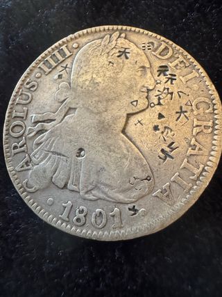 Moneda de plata de 8 Reales acuñada en México en el año 1801. Presenta el busto de Carlos IIII. Resellos chinos - Año: 1801 - Ceca: México - Denominación: 8 Reales - Material: Plata Preferible trato en mano. Hago envíos ordinarios (1€) o certificados (5,5€). Pago mediante bizzum o transferencia! NO LEER Euro, columnario, moneda, plata, real, peseta, real, escudo, billete, onza, colección, numismática, medalla, oro, cobre, Isabel II, resello, inversión, NGC, NCV, patagon, ducaton, franco.
