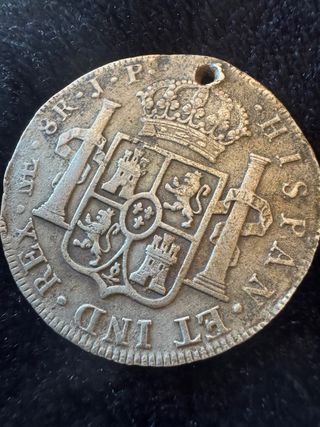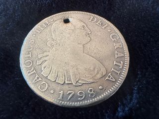 Moneda de 8 Reales acuñada en Potosí en el año 1798. - Canto con inscripción. - Presenta un orificio en la parte superior. Preferible trato en mano. Hago envíos ordinarios (1€) o certificados (6€). Pago mediante bizzum o transferencia! NO LEER Euro, columnario, moneda, plata, real, peseta, real, escudo, billete, onza, colección, numismática, medalla, oro, cobre, Isabel II, resello, inversión, NGC, NCV, patagon, ducaton, franco.
