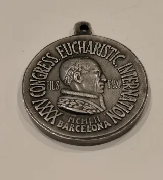 Medalla conmemorativa del XXXV Congreso Eucarístico Internacional. - Representa al Papa Pío XII. - Conmemora el evento de Barcelona en 1952 (MCMLII). - Diseño circular con perfil del Papa y texto grabado.