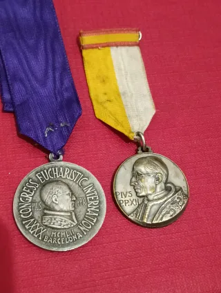 Conjunto de dos medallas conmemorativas del Papa Pío XII. - Medalla del XXXIV Congreso Eucarístico Internacional de Barcelona, MCMXLIX. - Medalla con el retrato del Papa Pío XII y la inscripción PIVS PP.XII. de Roma Precio por todo Señales del tiempo Tal cual en las fotos que es parte importante de la descripción envío