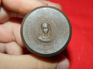 Troquel de acero con diseño religioso de una niña, ideal para crear medallas. en positivo, presenta oxidaciones y desgastes, muy bello, para coleccionistas, peso 298,3 gramos. - Material: Acero. - Diseño: Figura de niña en relieve. - Uso: Creación de medallas o sellos.