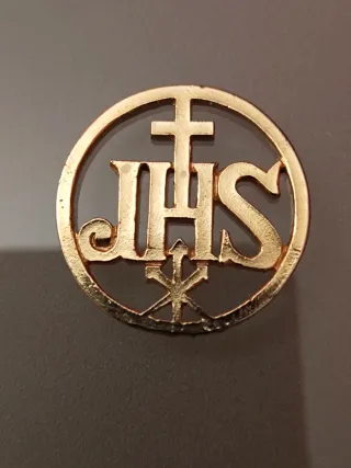 Medalla religiosa con el símbolo IHS, que representa a Jesús, junto a una cruz y el símbolo Chi-Rho. - Diseño circular. - Acabado metálico.