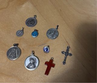 Conjunto de medallas religiosas de estilo antiguo, perfectas para coleccionistas o devotos. - Diversos diseños y tamaños. - Materiales variados, incluyendo metal plateado y bronce. - Representaciones de santos y cruces.