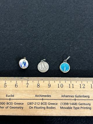 Tres preciosas medallas antiguas de plata. Ideales para coleccionistas o amantes de artículos religiosos. - Son tres medallas pequeñas, con imágenes religiosas. - Se aprecian detalles delicados en el diseño. - Están en buen estado de conservación.