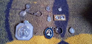Lote compuesto por 5 medallas , dos llaveros y una figura para el coche, religiosas con diferentes imágenes cualquier duda mandame un mensaje todas 20 euros Lote variado de artículos religiosos y decorativos. - Incluye 5 medallas de diferentes diseños. - Dos llaveros con medallas. - Un artículo adicional sin especificar.