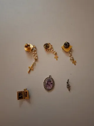 Conjunto de seis artículos religiosos variados. - Incluye medallas y cruces. - Diseños dorados y plateados. - Cuentas tipo perla en algunas piezas. Necesito liberar espacio Precio fijo No regateos #lotereligion6euros #oferta6euros