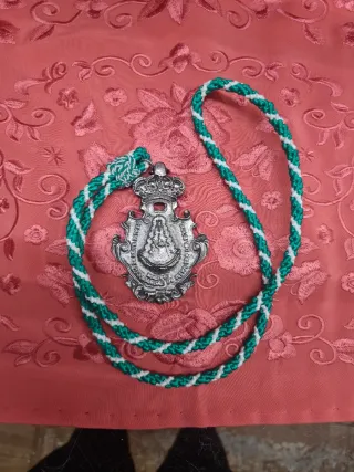 Medalla religiosa del Rocío con un cordón trenzado en verde y blanco. - Diseño detallado de la Virgen del Rocío. - Cordón trenzado de dos colores. - Cierre seguro.