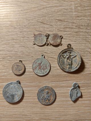 12 medallas antiguas y 5 figuras religiosas, el precio es por lote,