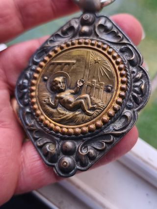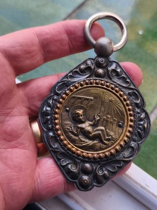 Medalla religiosa con la imagen del Niño Jesús en el pesebre. Detalle de la estrella de Belén y vallas. - Antiguamente se colocaban en las cunas de los nenes. - Diseño en forma de rombo. - Borde decorativo con cuentas. - Colgante con anilla.