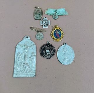 Conjunto de seis medallas religiosas variadas. - Incluye medallas con imágenes de la Virgen María y el Sagrado Corazón de Jesús. - También se incluye un crucifijo. - Material metálico.