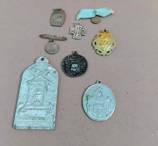 Conjunto de nueve medallas antiguas con motivos religiosos. - Medalla de la Virgen de Lourdes, Hospitalidad de Barcelona. - Medalla de la Virgen con el Niño. - Medalla de San Juan Bautista. - Medalla de la Sagrada Familia. - Medalla dorada del Sagrado Corazón. - Medalla de Santa Ana. - Medalla ovalada con figura religiosa. - Medalla de San José. - Medalla de la Armada.