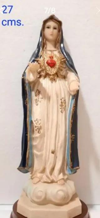Bonita figura ( Nueva) del Inmaculado Corazón de Maria de 27 cms. De alta. Pintada a mano viene en su peana . Hecha de resina multiresistente. Embalada en su caja de fabrica. Representa la pureza y amor del inmaculado Corazón de la Santísima Virgen. Bonito regalo por 19€ La envíamos a través de Wallapop envíos. Hacemos lotes especiales de varios artículos. Personalizamos Rosarios y Medallas. Más figuras del Santoral en nuestro perfil. Siganos por Instagram @elhogardelrosario.