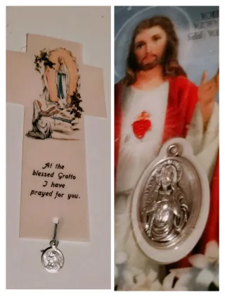 Conjunto de medalla del Sagrado Corazón y una estampa religiosa con su propia medalla. - Medalla del Sagrado Corazón. - Estampa con imagen religiosa. - Medalla adjunta a la estampa.
