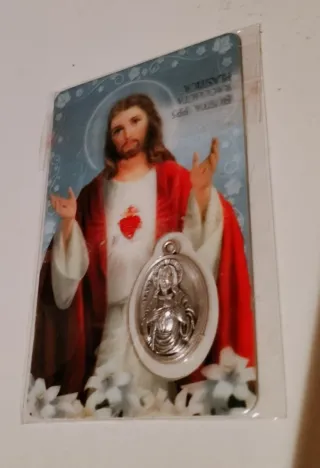 Lote que incluye una bonita figura del Sagrado Corazón de Jesús.Perfecto para devotos, coleccionistas, altares...incluye una estampa que facilita la conexión espiritual para orar y realizar peticiones o favores y una medalla protectora para llevarla siempre contigo.La figura es de marmolina,con colores vivos y un buen acabado.Pintada por artesanos. Base con nombre. -Figura mide 20,5cm. -Estampa plastificada que mide 7cmx5cm aproximadamente. -Medalla protectota de 2,50cm,material de metal. Artículos nuevos y bendecidos.Ideal para regalo o uso propio.