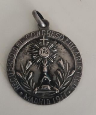 Medalla conmemorativa del Congreso Eucarístico de Madrid de 1911. Representa el Sagrado Corazón de Jesús. - Para el envío, para que quede bein sujeta, colocaré la medalla dentro de la caja de cigarrillos metalica que funciona correctamente, como regalo. - Diseño circular con imagen central. - Inscripción en el borde:BENDITO SEA EL SAGRADO CORAZON EUCARISTICO DE JESUS. - Inscripción Congreso Eucaristico madrid 1911. - Colgante para cadena.